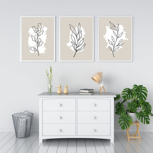 Botanical Minimalist Wall Print Set of 3 | Abstract Line Leaves Wall Art Poster | Line Art Drawing Home Decor