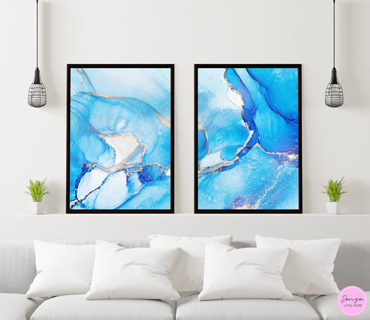 Blue Marble Wall Print Set of 2 | Ocean Blue Minimalist Marble Art Poster | Living Room Bedroom Wall Home Decor